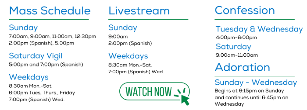 Sunday: 7:00am, 9:00am, 11:00am, 12:30 pm, 2:00pm (Spanish), and 5:00pm