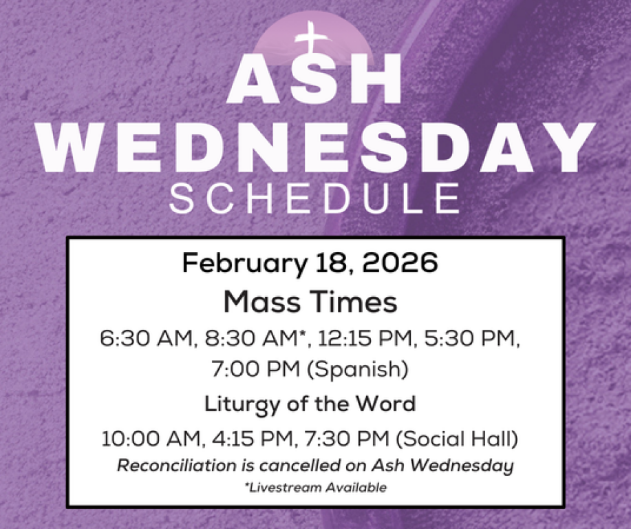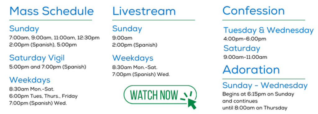 Sunday: 7:00am, 9:00am, 11:00am, 12:30 pm, 2:00pm (Spanish), and 5:00pm
