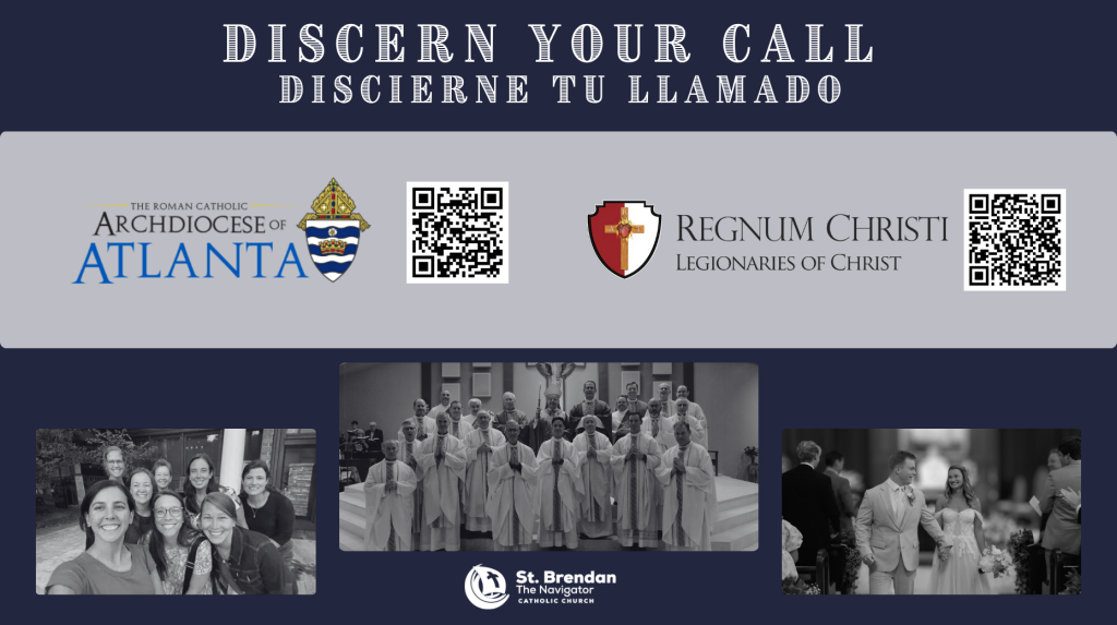 Those interested in ministry as a priest, deacon, sister or brother may also speak with our Pastor to learn more and assist with discernment. Call the parish office at 770-205-7969 to make an appointment. Additional information is also available by visiting the Archdiocese Office of Vocations Website